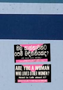 2001 Stickers with the message ‘Are you a woman who loves women?’ were pasted in public places in Sinhala and English. The WSG’s telephone number and the COJ’s Wattala PO Box address were also mentioned on stickers. The goal was to engage community members with WSG through this sticker campaign.   click here to read more.